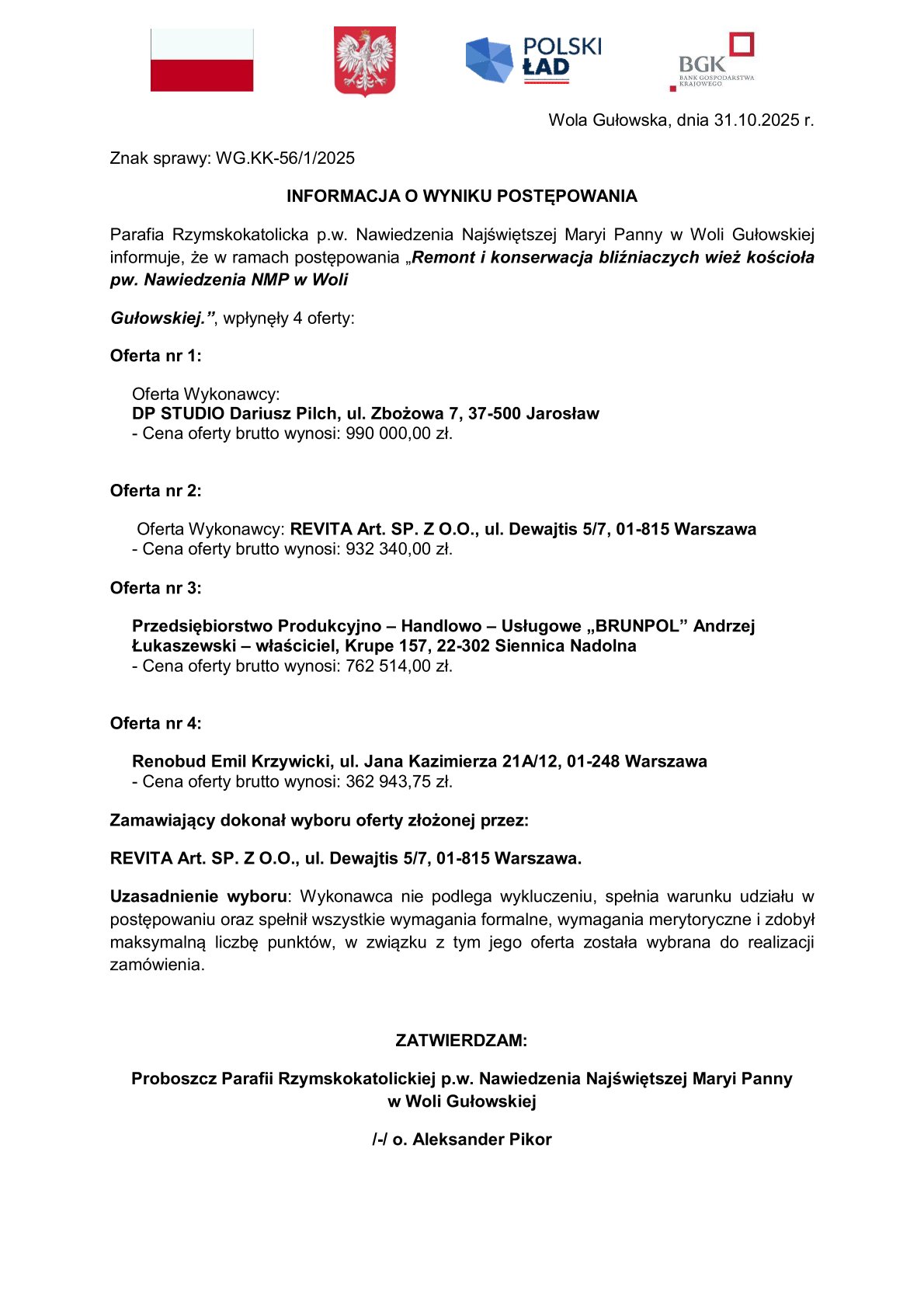 Informacja o wyborze wykonawcy remontu i konserwacji bliźniaczych wież kościoła w Woli Gułowskiej