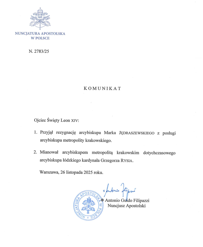 26 listopada 2025 roku, w samo południe i jednocześnie w dwóch Kuriach Metropolitarnych: krakowskiej (link) i łódzkiej (link), odczytany został komunikat nuncjatury apostolskiej w Polsce. Tym komunikatem przekazano decyzje Ojca Świętego Leona XIV o przyjęciu rezygnacji abpa Marka Jędraszewskiego z funkcji metropolity krakowskiego i mianowaniu jego następcą kard. Grzegorza Rysia. Z odczytanego Komunikatu wynika, że obaj dotychczasowi biskupi diecezjalni są odtąd wyłącznie administratorami apostolskimi swoich dotychczasowych diecezji do czasu kanonicznego objęcia funkcji biskupa diecezjalnego krakowskiego przez kard. Rysia. Ingres w Krakowie, zaplanowany jest wstępnie na dzień 20 grudnia 2025 r.