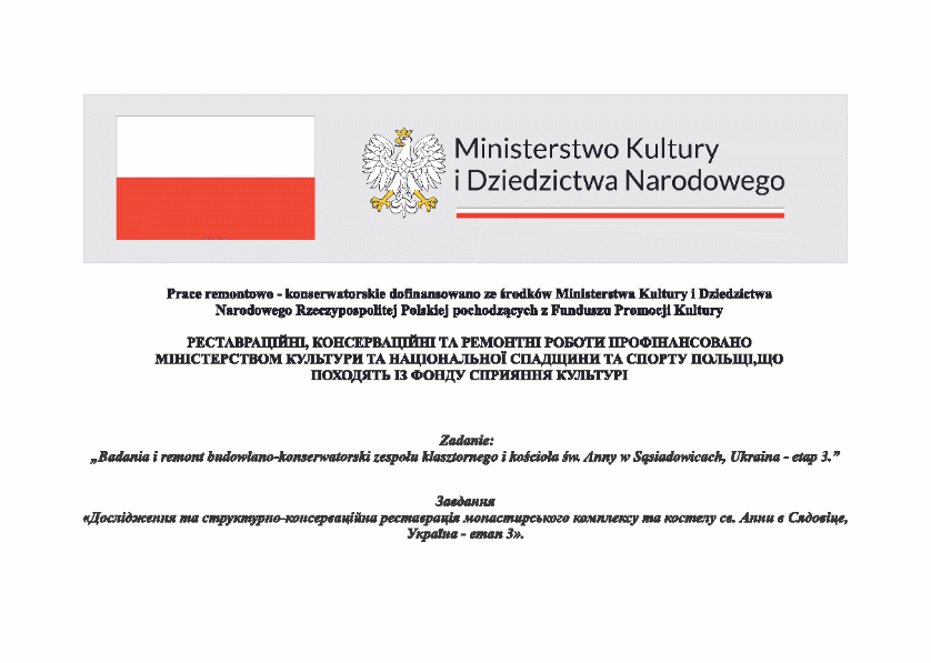 PROJEKT REALIZOWANY PRZEZ PROWINCJĘ POLSKĄ PW. ŚW. JÓZEFA ZAKONU BRACI NAJŚWIĘTSZEJ MARYI Z GÓRY KARMEL (ZAKON OO. KARMELITÓW PROWINCJA), dofinansowany ze środków Ministerstwa Kultury i Dziedzictwa Narodowego Rzeczypospolitej Polskiej, pochodzący z Funduszu Promocji Kultury, na zlecenie Narodowego Instytutu Polskiego Dziedzictwa Kulturowego za Granicą POLONIKA: Remont budowlano – konserwatorski elewacji kościoła pw. św. Anny w Sąsiadowicach, Ukraina – etap 3